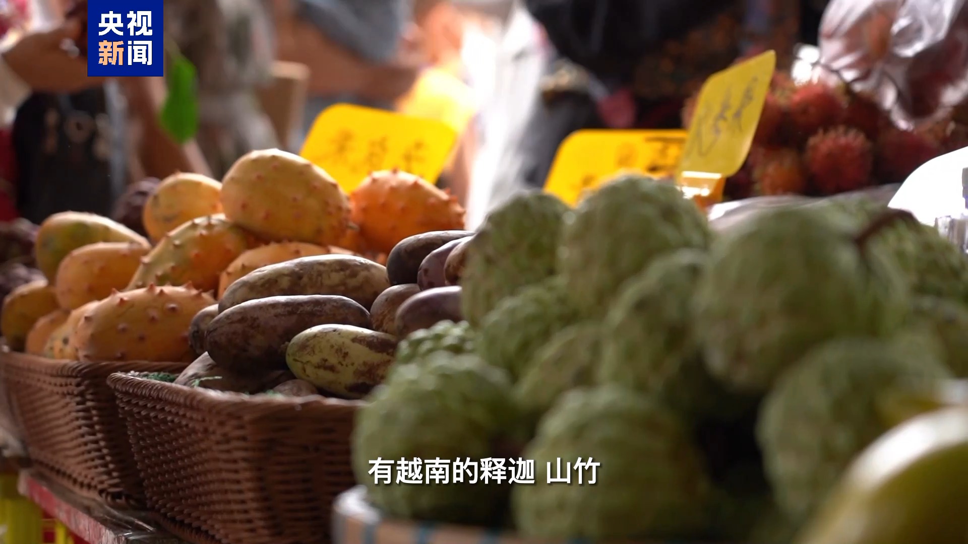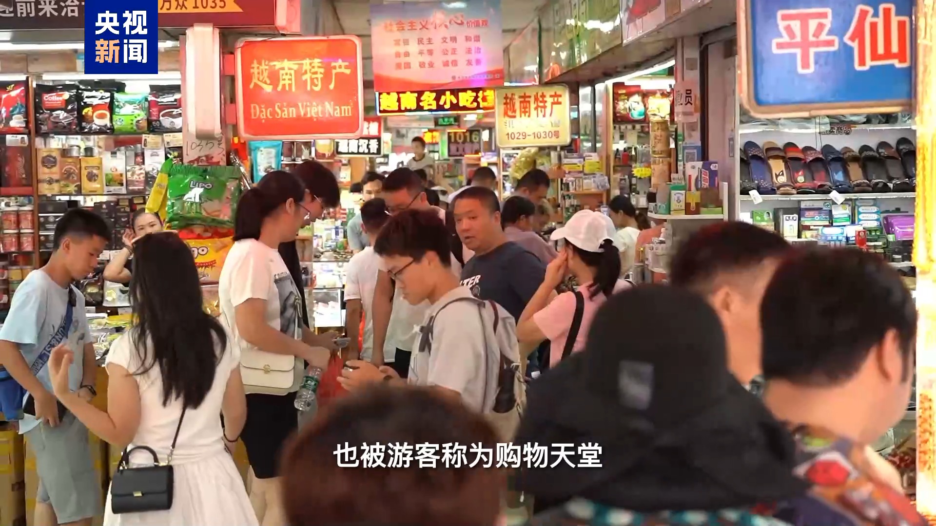 一路过去,沿街摊位卖得最多的就是各种东盟水果,有越南的释迦、山竹,泰国的榴莲、椰子等等,这些摊位有多受欢迎,咱们看看人挤人的现场就知道了。