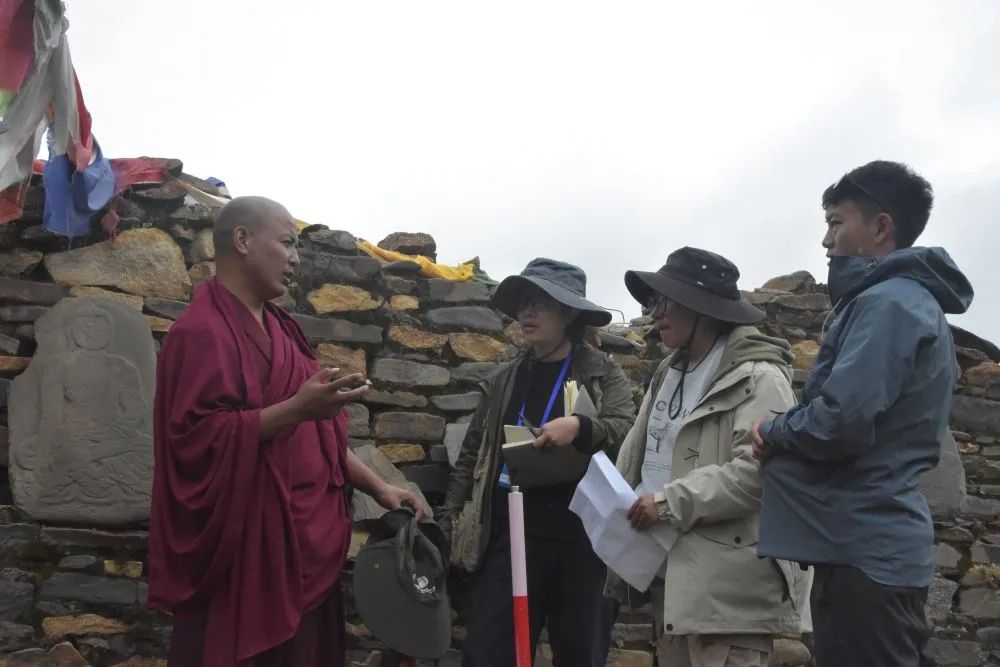 普查队员正在向了解当地历史文化的僧人咨询塔巴遗址历史沿革。新华社记者 春拉 摄