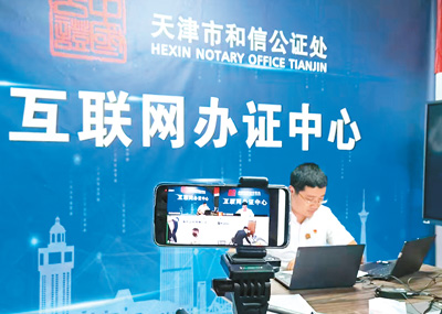 工作人员使用远程视频公证为海外侨胞办理业务。天津和信公证处供图