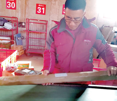 快递员邢万良在分拣包裹。