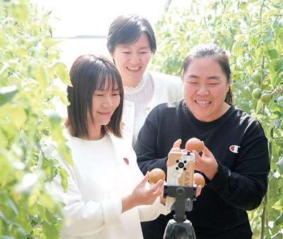 北京平谷区一家农业合作社工作人员直播销售本地农产品(资料图片)。
