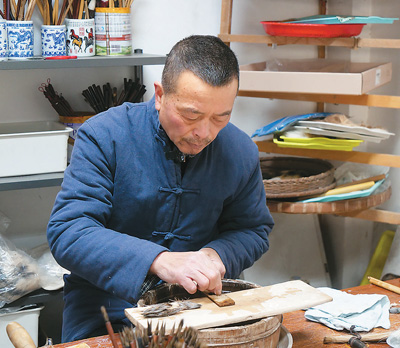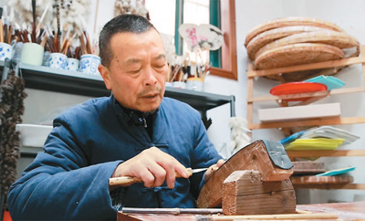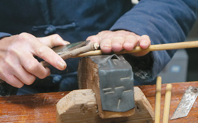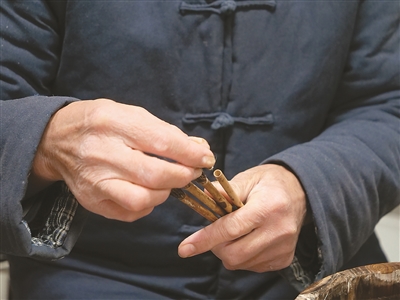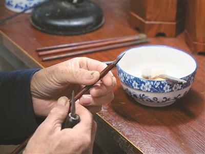 根据笔头大小,使用工具将笔杆凿出相应尺寸的孔。本报记者 丁美栋摄