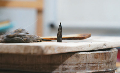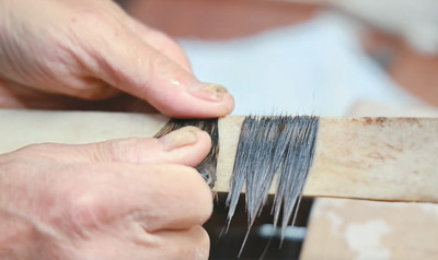 制作笔头从理毫开始,将毛的根部理齐。然后整理毛的头部,这一步叫齐毫。齐毫后的笔毛变成一片一片的,方便做成圆锥形。图为齐毫。本报记者 丁美栋摄