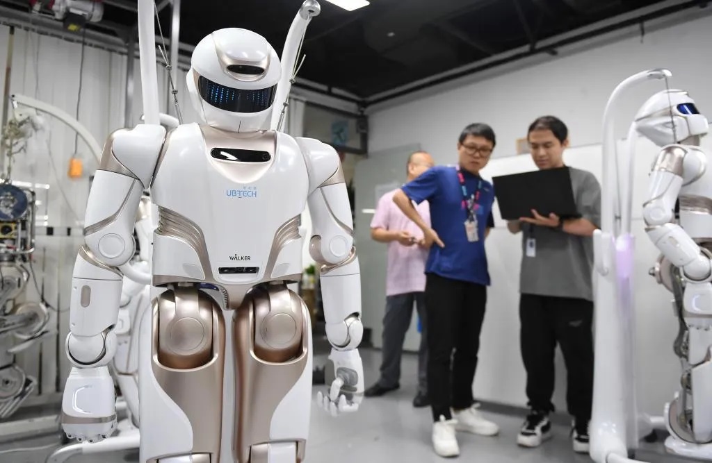 在位于深圳市南山区智园的优必选总部,工作人员对人形机器人进行测试。图源:新华社