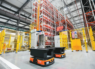 在黑龙江省哈尔滨电机厂有限责任公司线圈分厂智能制造车间,两辆线圈产品智能制造系统运输车在等待运行指令。新华社记者  王松摄