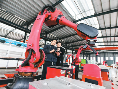 江西省宜春市万载县工业园区龙恩智能装备有限公司生产车间里,工人正在对机器臂进行系统编程。邓龙华摄(人民视觉)