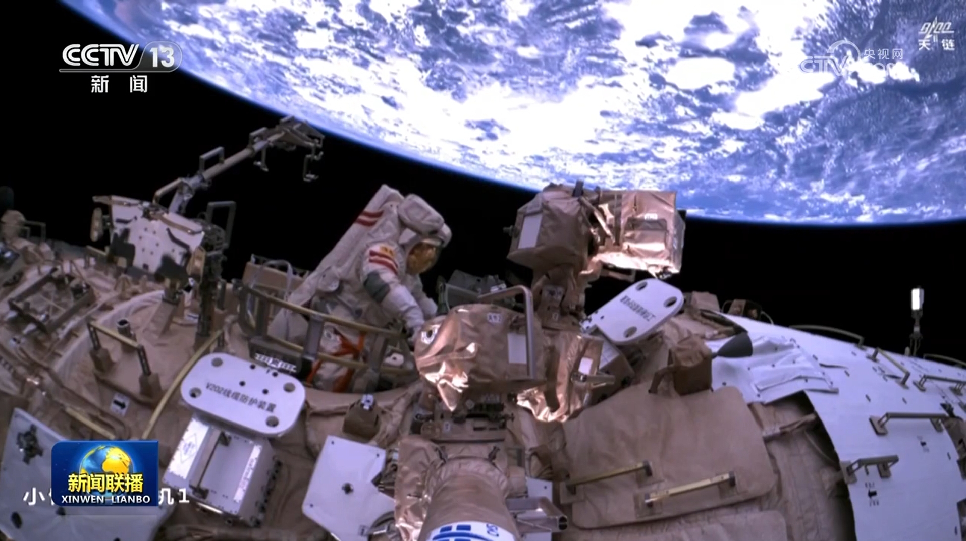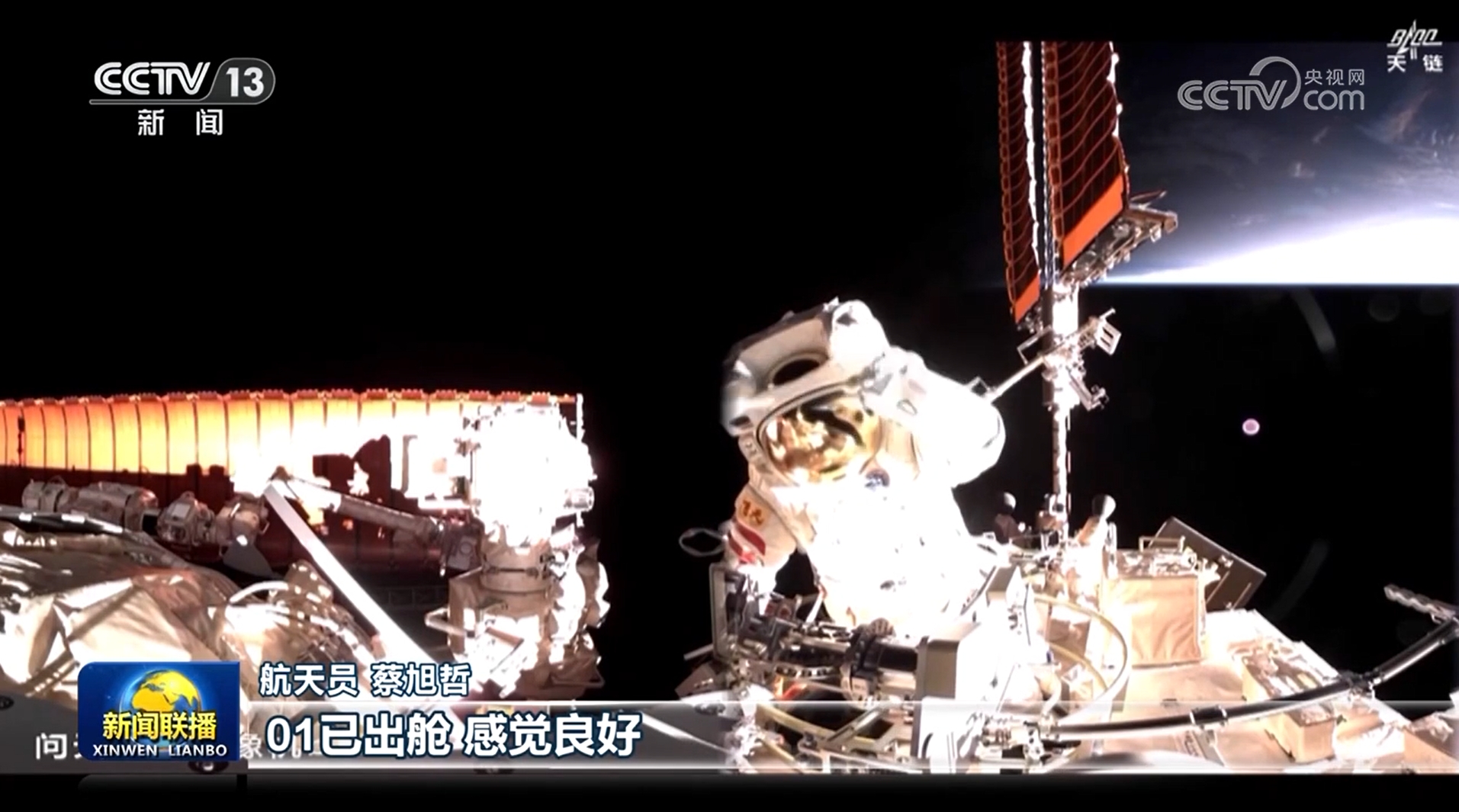 完成设备安装工作后,蔡旭哲搭乘机械臂运动至空间站对接口的巡检点位,进行拍摄巡检工作。此次出舱活动历时约7小时,在空间站机械臂和地面科研人员的配合支持下,航天员乘组完成了空间站空间碎片防护装置和舱外辅助设施安装、舱外设备设施巡检等任务。