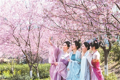 在四川省成都市举办的“花朝霓裳·锦绣春行”春日文旅活动上,市民游客穿着汉服踏青赏花,沉浸式体验非遗市集、中医药文化;上海静安区大宁公园以“花朝春时,香郁良辰”为主题,以郁金香、樱花、海棠、白玉兰的天然花期作序,借十二花神华服巡游,展示古风国韵;湖南长沙在世界之窗建造百亩牡丹花海,将电视剧《国色芳华》从荧屏搬到现实,人们纷纷身着唐风服饰打卡拍照;位于湖北武汉的东湖风景区推出了水陆赏樱游线,游客身着各式传统服饰,沿着《楚辞》里的沧浪亭、行吟阁体验荆楚春意。