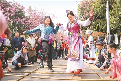 游客在云南省昆明市呈贡区洛龙公园体验竹竿舞。
