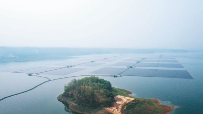 在印度尼西亚西爪哇省芝拉塔水库拍摄的中企承建芝拉塔漂浮光伏项目。新华社记者 徐 钦摄