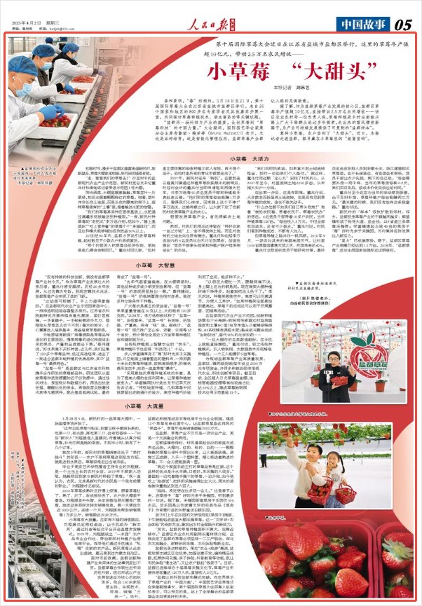 据了解,作为盐城草莓产业发展的核心区,盐都区草莓年产值超10亿元,直接带动2.5万名农民增收……该区农业农村局一位负责人说,草莓种植是乡村全面振兴路上广大干部群众经过多年探索,走出来的富民增收新路子,为产业可持续发展提供了可复制的“盐都样本”。
