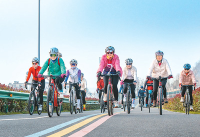 在安徽省芜湖市繁昌区峨山镇,骑行爱好者在人民体育公园里骑行锻炼。肖本祥摄(人民图片)