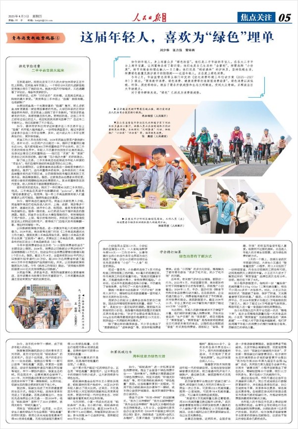 如今的年轻人,身上有着众多“绿色标签”。他们是二手市场的寻宝人,在各大二手平台上淘寻宝藏,让闲置物品有了新归宿;他们也是自己生活的“金掌柜”,按需选购“小份菜”,将节约粮食的理念融入一日三餐;他们还是“蚂蚁森林”的护林员,坚持低碳生活,积攒绿色能量兑换沙漠中的梭梭树……这届年轻人,正在爱上绿色消费。