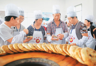 在第六期缙云烧饼培训班开班仪式上,67人参加培训,其中贫困户52人。目前,缙云县已协助南江县组织缙云烧饼培训6期135人次。钟继明摄