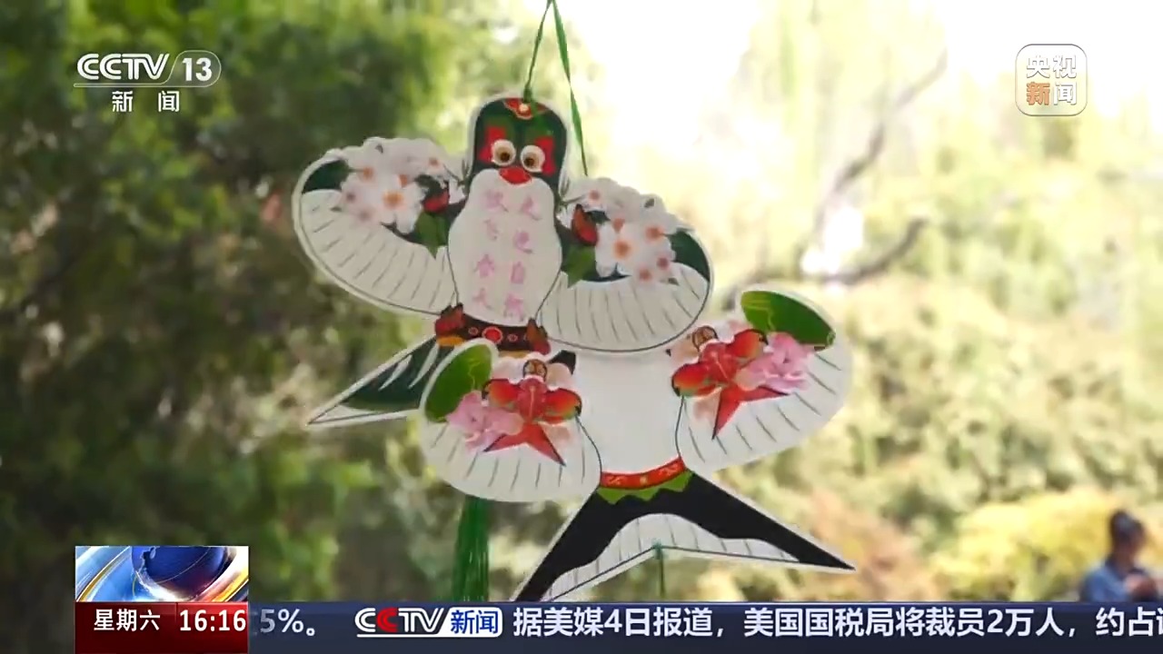 在江苏扬州的茱萸湾景区,游客们还动手制作传统纸鸢,写上美好寄语。