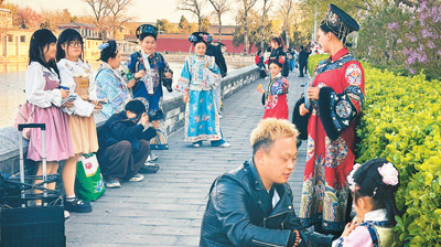 在北京市故宫角楼外,妆造体验消费者正穿着各式服装打卡拍照。本报记者  孔德晨摄