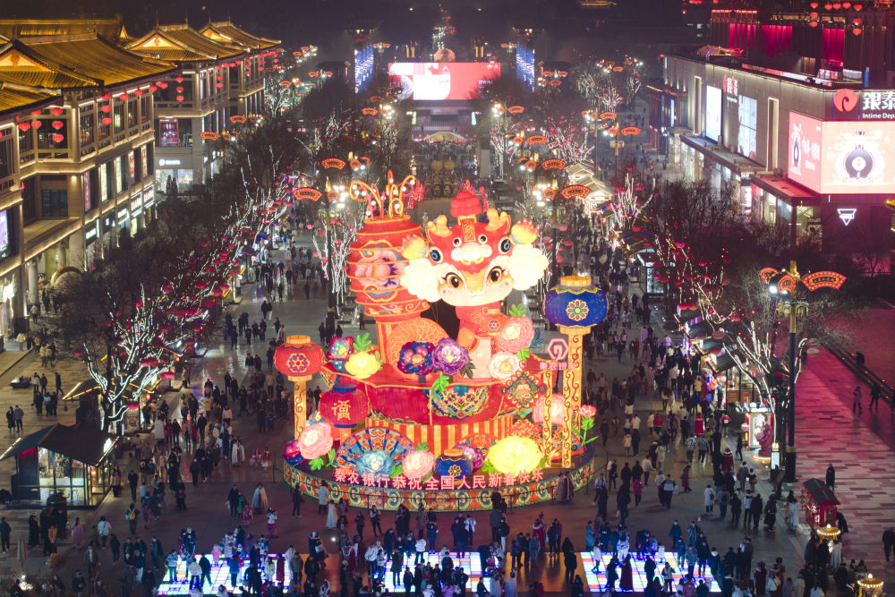 市民游客在西安大唐不夜城游玩、消费(1月22日摄,无人机照片)。新华社记者 邵瑞 摄