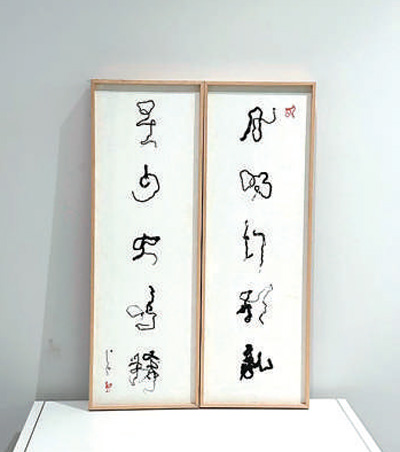 工作室里,不论红房子还是泥蜂舍,到处装饰着工整的对联、门牌、题字,乍一看像那么回事,仔细看却几乎全都不是汉字。在朱赢椿提示之下,这些弯曲缠绕的字才能被辨认出来。