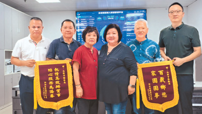 新加坡华裔黄映霞(右三)通过广东汕头“潮汕家园”平台成功寻亲后,与寻亲团一行向当地侨务部门赠送锦旗,表达感激之情。“潮汕家园”平台供图
