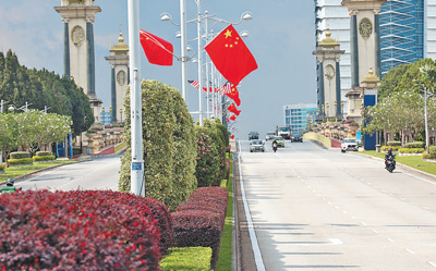 4月15日,马来西亚行政首都布特拉加亚街头悬挂着中马两国国旗,欢迎习近平主席到访。