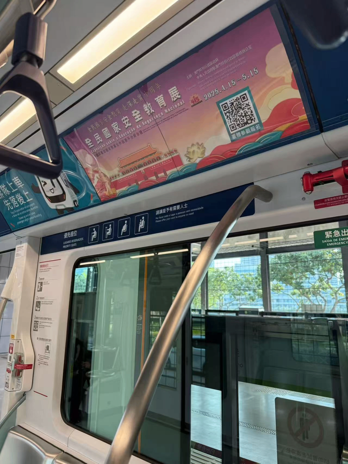 与此同时,无论走在澳门街头,还是走进澳门轻轨车站,都能看到12路、101X路、MT1路等公交车身上,以及轻轨车站、车厢内展示的全民国家安全教育日主题标语、澳门“全民国家安全教育展”的展期等内容,让市民和游客随时随处看到感受到国家安全人人有责的理念,身体力行自觉维护国家安全。
