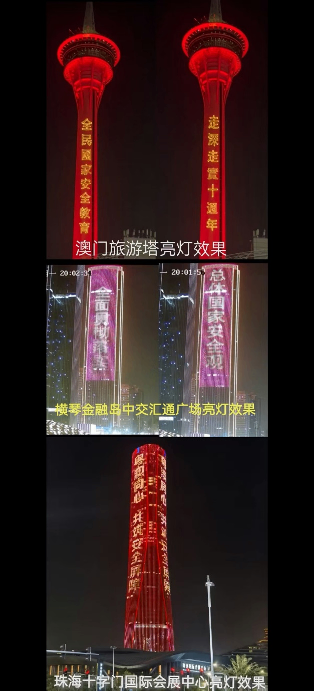据悉,澳琴珠三地同时点亮城市地标将持续至4月21日,每晚19:30-22:30同时亮灯,并滚动显示“全面贯彻落实总体国家安全观”、“全民国家安全教育 走深走实十周年”和“粤澳同心  共筑安全屏障”3组国家安全宣传教育标语。