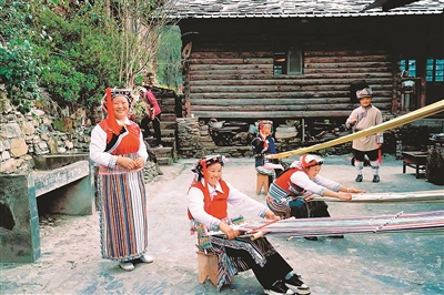 雾里村的怒族妇女正在展示当地传统手工织布。胡俊摄