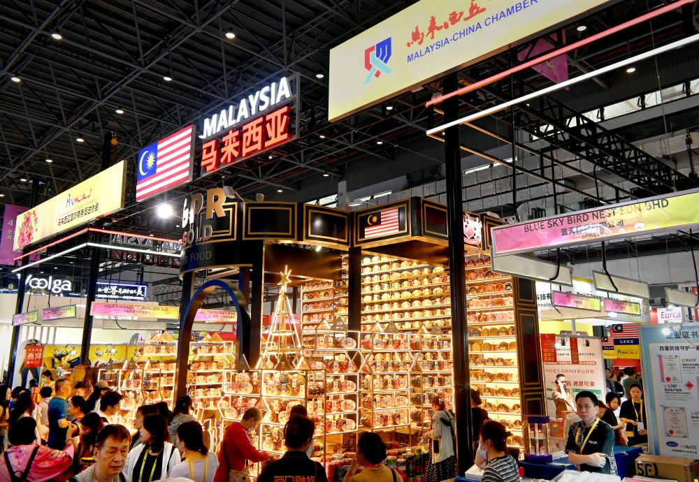↑4月16日,位于消博会4号馆的马来西亚展馆一角。王颂 摄