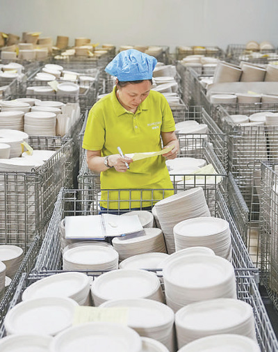 4月15日,工作人员在位于云南省临沧市的绿赛可新材料(云南)有限公司包装车间内查验以甘蔗渣为原料制作的可降解餐具产品。新华社记者 陈欣波摄
