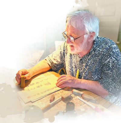小何是德国人,名克里斯托弗,姓哈博斯梅尔,退休前是挪威奥斯陆大学教授,如今定居丹麦。出于学术交流需要,在印欧语系近10种语言中辗转切换是他的日常。在他的家中,中文是最醒目的存在:从走廊到会客室、书房、资料库,从墙壁、窗户到书柜侧身,中国书画、中国友人的往来信札随处可见。他喜欢坐在摆着各种印章的老木桌前,在笺纸上用毛笔誊写学人知见或自撰打油诗,乐哉悠哉。