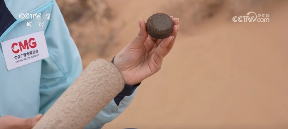 记者手里拿的就是今年首次应用于治沙的种植杯和种子绳,它们可以去解决沙坡顶部和沙漠边缘难点区域的治理问题。有的区域沙坡顶部风力大、流沙快,一般植被比较难以存活。这种植杯外层就能起到很好的防风防沙作用,同时里面还配有一块一体化的有机肥和保水剂,这样一来种子的存活率就可以提高30%。