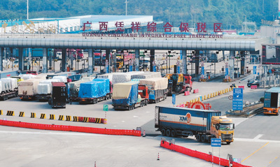 随着中越经贸合作日益紧密,中越双边贸易呈现出良好发展态势,主要边境口岸一派繁忙景象。图为广西壮族自治区凭祥综合保税区。