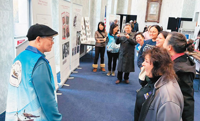 美国飞虎队研究院院长陈灿培(左一)向美国民众介绍飞虎队事迹。