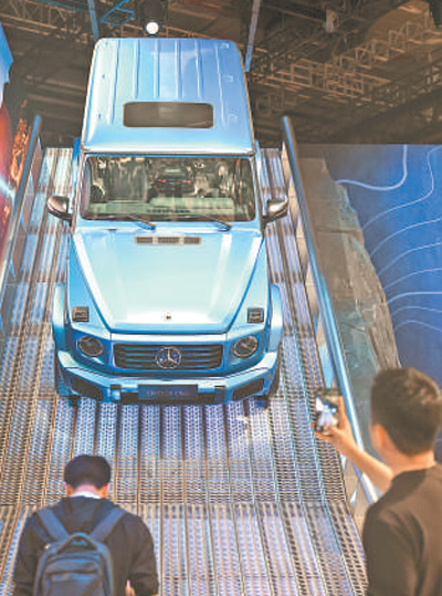 图为4月23日,观众在上海车展奔驰汽车前拍照。