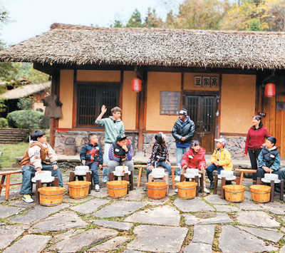 跨国创业团带领研学团体验古法豆腐制作流程。