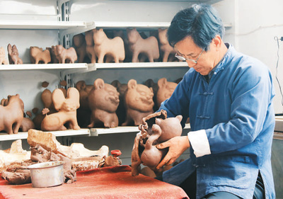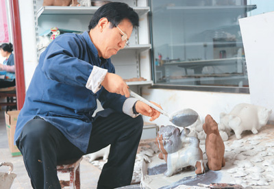 胡新明在给泥塑进行粉洗。本报记者 高炳摄