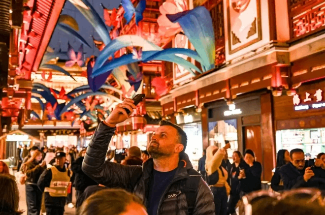 2024年12月4日,来自波兰的游客在上海豫园商城拍照。图源:新华社