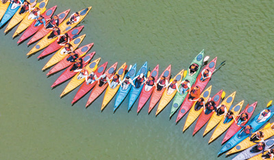 4月25日,重庆市南川区黎香湖镇黎香湖皮划艇基地,游客们在湖里体验水上运动乐趣。据介绍,“五一”假期期间该皮划艇基地已预约满员。胡 波摄(人民视觉)