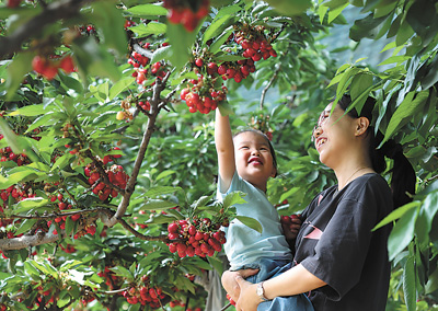 在河北石家庄的采摘园里,游客采摘樱桃。张晓峰摄(影像中国)