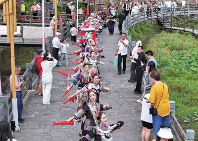 在湖南怀化的景区里,游客观看民族服饰表演。李尚引摄(人民视觉)