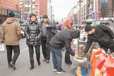 俄罗斯游客在黑龙江省黑河市逛文化街早市。新华社记者 谢剑飞摄