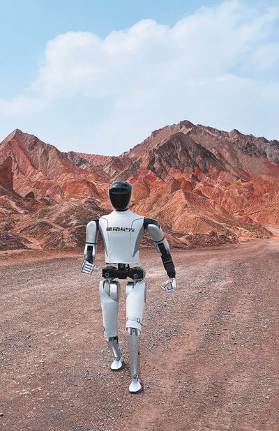 星动纪元第六代人形机器人“星动STAR1”跑步穿越河西走廊丹霞地貌。
