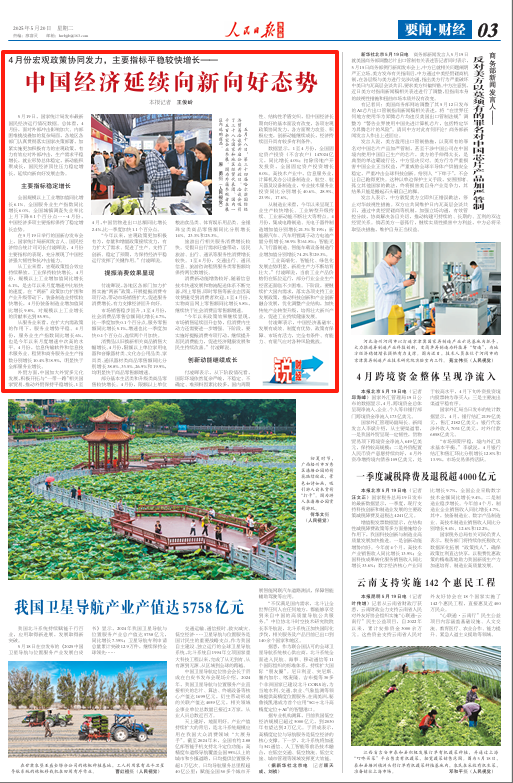 5月19日,国家统计局发布最新国民经济运行情况数据。总体看,4月份,面对外部冲击影响加大、内部困难挑战叠加的复杂局面,各地区各部门认真贯彻落实国家决策部署,加紧实施更加积极有为的宏观政策,有力有效应对外部冲击,生产需求平稳增长,就业形势总体稳定,新动能积聚成长,国民经济顶住压力稳定增长,延续向新向好发展态势。