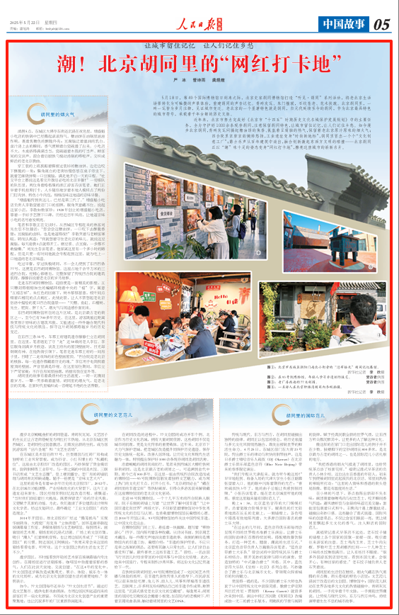 胡同里的生活仍在继续,烟火气藏在热气蒸腾的早点摊、街头巷尾的特色小店里;文艺范儿浸润于改造后的文创园、博物馆中;国际范儿跃动在世界各地多元文化的热情碰撞中。青砖灰瓦的胡同,一手托举着千年文脉,一手拥抱世界潮流,让传统与现代交织,东方与西方共鸣,持续演绎着生生不息的城市故事。(严冰 管诗雨 龚煜煊)
