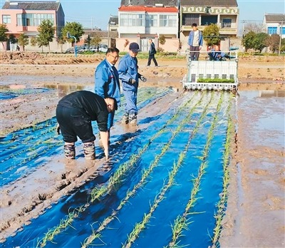 还有一个看似老生常谈的难点——耕整地。不同于传统插秧,覆膜插秧对耕地平整度要求较高。秸秆还田质量不高、表层浮茬多、整地质量差田面起伏过大,都会导致覆膜栽插质量不高。“为此我们针对覆膜插秧专门制定了一套规范化的深耕、埋茬、平整、机插的作业标准,确保膜铺得稳、苗插得准。”江苏省农业科学院农用新材料创新团队首席徐磊副研究员说。