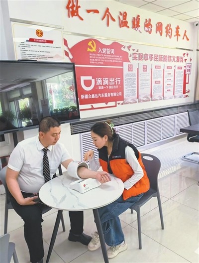 乌鲁木齐市网约车行业工会为网约车司机测量血压。
