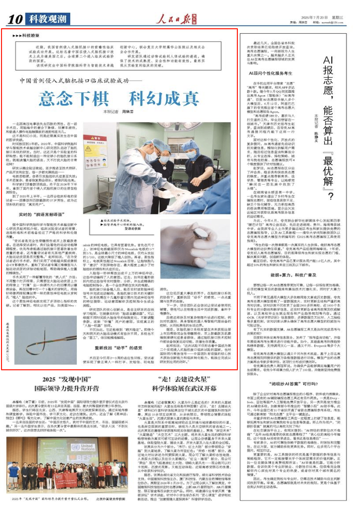 赵郑拓说:“这次试验不仅标志着中国成为第二个实现侵入式脑机接口临床试验的国家,也对国际同行释放信号——中国团队有很强的核心技术原始创新能力和临床转化能力,能独立完成从研发到应用的闭环。”(本报记者 周姝芸)
