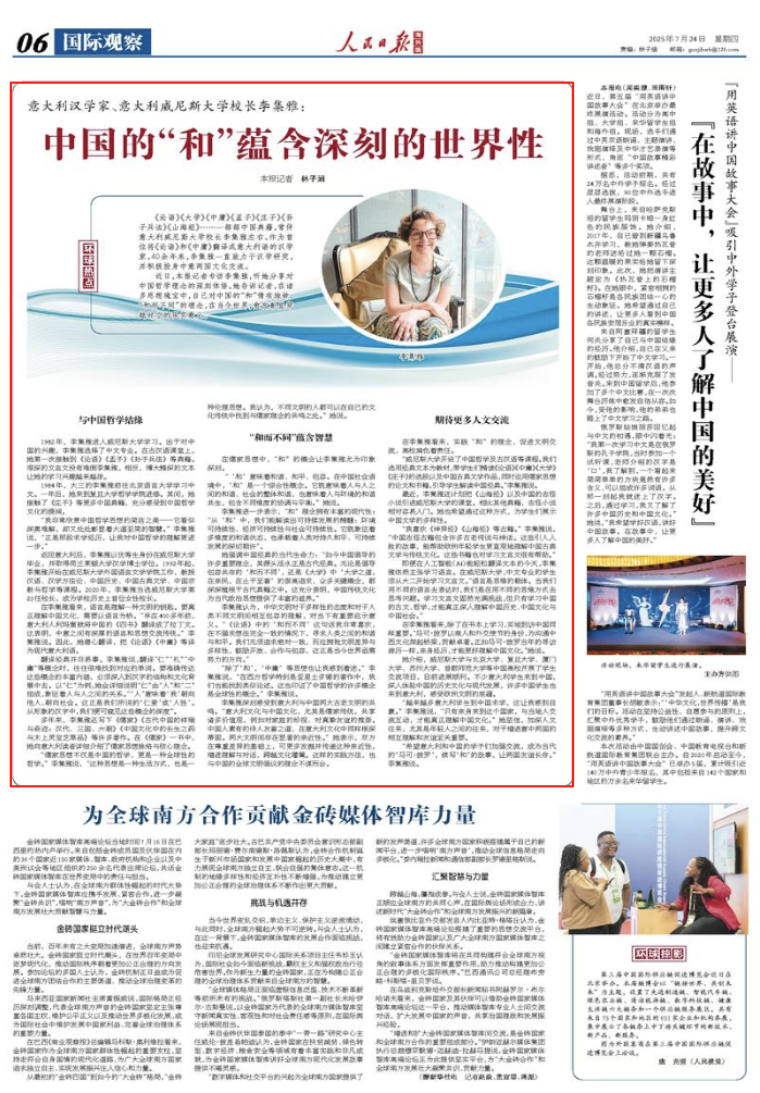 李集雅深刻感受到意大利与中国两大古老文明的共鸣。“意大利文化与中国文化,尤其是儒家传统,共享诸多价值观,例如对家庭的珍视、对真挚友谊的推崇。中国人素有的待人友善之道,在意大利文化中同样根深蒂固。两大文明间存在显著的亲近性。”她表示,双方在尊重差异的基础上,可更多发掘并传递这种亲近性,增进理解与对话,跨越文化藩篱。这样的实践方法,也与中国的全球文明倡议的理念不谋而合。