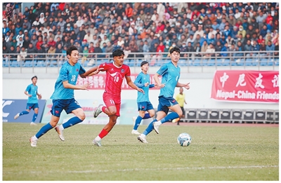 近日,第二届中尼友谊足球赛在尼泊尔首都加德满都达什拉特体育场举行。图为中国云南省青年队与尼泊尔国家青年队在绿茵场上激烈角逐,两国观众呐喊助威。