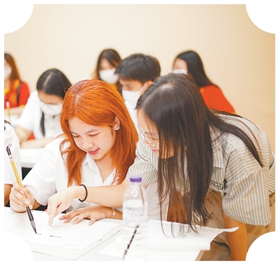 泰国学生在位于泰国博仁大学的海上丝路孔子学院课堂上学习书法。
